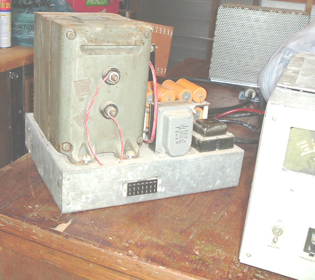 I acquired this amplifier in the Fall of 2004. When I first saw the pix I suspected that it was a Hallicrafters HT-33 that had been re-packaged. It turned out that it was. The RF deck had been saved intact, but almost all the power supply components were not original Hallicrafters. The owner had made a very nice cabinet for the RF deck, assembled almost totally with "pop-rivets." The power supply was on a galvanized sheet metal chassis that was a bit light for the weight of the HV transformer and other components, again assembled with pop-rivets. A very nicely formed and welded cover had been made of heavy gage perforated stainless steel. It may have been an HT-33A, and upgraded to an HT-33B.