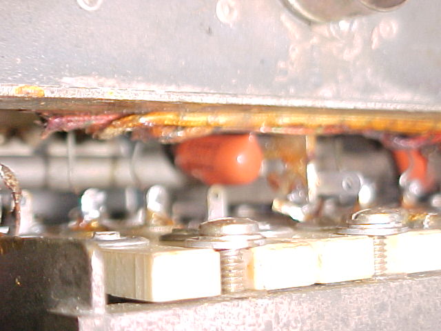 The AC line bypass caps have been broken open (probably when under power, as evidenced by the scorched area of the chassis) and disconnected.