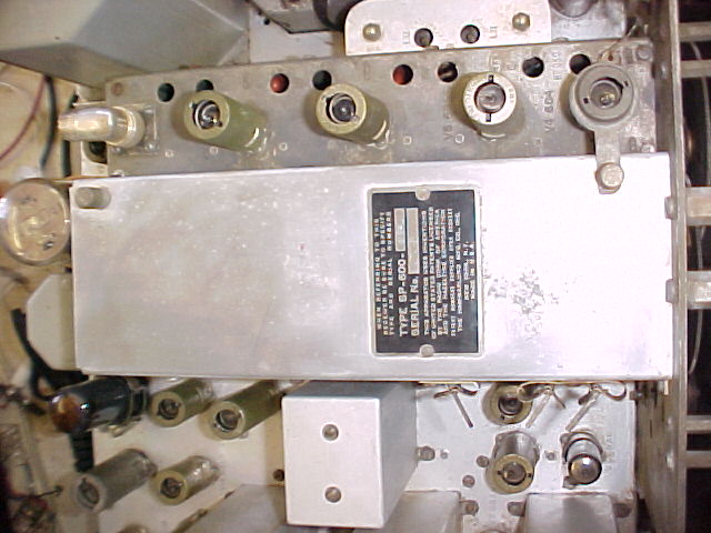 The chassis is generally dirty, but no major corrosion and should clean up very well. The IF cans are have a normal matte appearance, no pitting or discoloration. They could be left as is after cleaning, or polished to be shiny. The right side dial lamps are missing, as is the wiring for all lamps. There is no wiring to the meter, the small terminal strip that mounts to the terminals is missing. The wires have been cut off close to the meter switch. The orig. 3 allen wrench keys are in place, only 2 tube shields are missing. The "hose clamp" style clamps are in place for the 6V6, 5R4Gy and the FCU's 6AC7, and the HF osc. 6C4 has it's proper shield with hold down tab. There's a rt angle coax fitting on the ant. conn. All tuning hole plugs are missing. All xtal hold-down fingers are intact on the FCU. One of the filter chokes has an open hole, it looks like the original solder to close it has been removed with a torch. The whole choke has been very hot, all the paint is peeling. The top of the RF deck cover has previously been polished, but not protected with a clear coat and is not uniformly shiny. (There's a similar area on the left side panel.)
