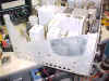 The left side has been re-capped, the 4 bathtubs on that side have been replaced, the filter capacitor & chokes have been removed to allow access to E-13 and it's 1 BBOD and the "pod." The filter choke with the hole in it has been isolated and checked with a megger, showing a resistance from the winding to ground of over 1000 megohms at 750 vdc. it apparently has not been damaged, but the reason for the paint peeling and the hole in the top of it is still a mystery.
